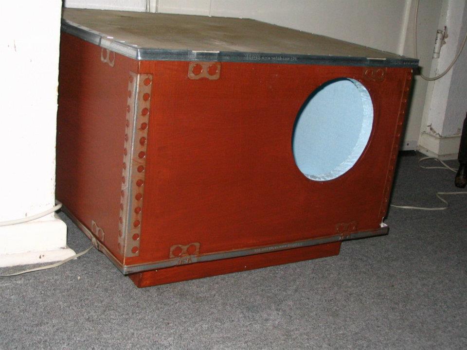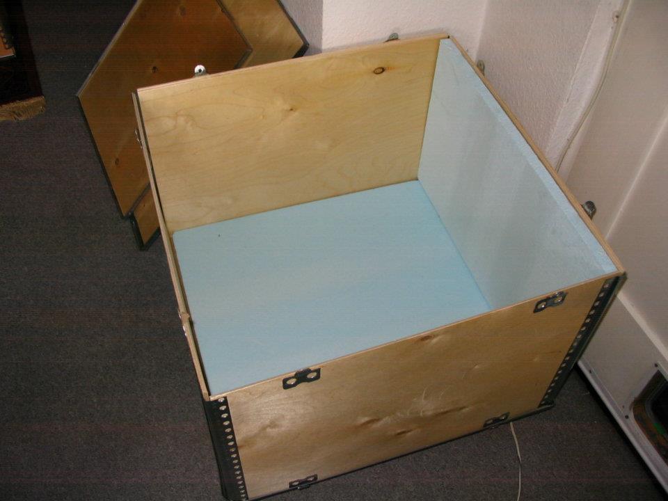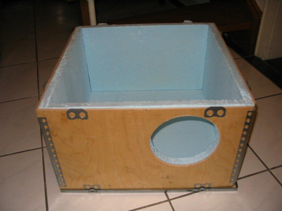 Die kleinere Kiste hat ungefähr die Maße von 50×50 cm und ist 45 cm hoch. Die Kiste wird innen mit 20 mm starken Wärmedämmplatten (Styrodor) aus dem Baumarkt ausgekleidet. Sie dämmen um ein Vielfaches als normales Styropor und lassen sich mit einem Teppichmesser passend schneiden und mit Montagekleber gut befestigen. So kann die Katze ihre Körperwärme optimal nutzen. Bevor alles verklebt wird, werden von innen die Kanthölzer festgeschraubt, die der Hütte als Füße dienen werden (s.u.)