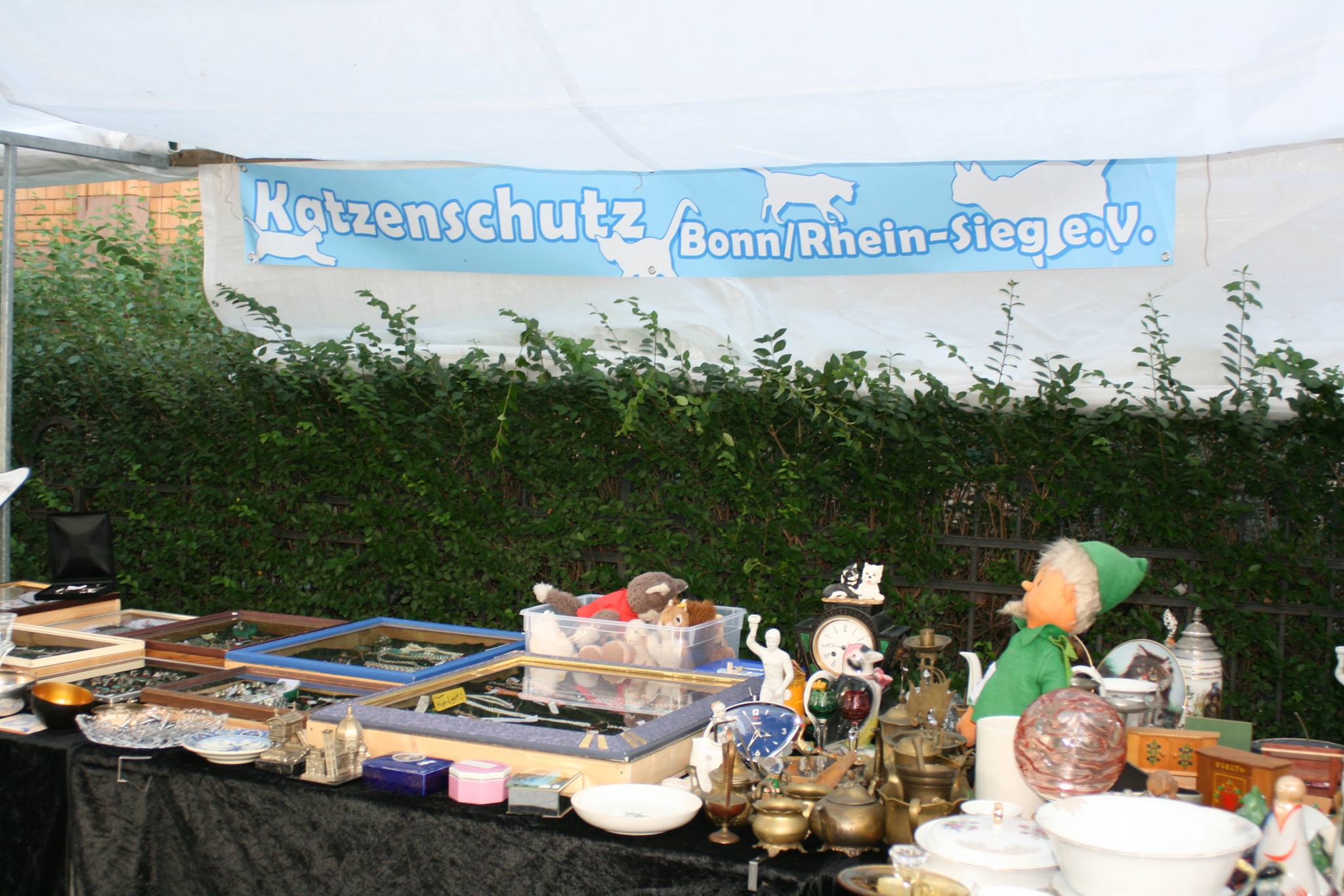Liebevoll und routiniert dekoriert Eva-Maria Kolfenbach den bereitgestellten Verkaufsstand mit allerlei antiken Kostbarkeiten. Vom Mocca-Gedeck über eine süße Mondphasen-Uhr bis hin zu kleinen Kuriositäten und altem Schmuck bietet sie antike Schätze an, deren Erlös dem Katzenschutz Bonn/Rhein-Sieg e. V. zugute kommt…
