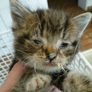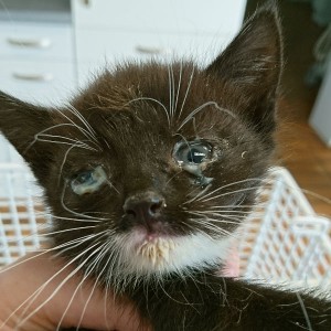 Ein paar junge Männer waren gerade dabei, einen vor wenigen Tagen aufgeschichteten Holzhaufen anzuzünden, da sahen sie eine getigerte Katze panisch davonrennen. Doch sie hörten noch immer ein klägliches Maunzen. Sofort löschten sie das Feuer und machten sich daran, dem Maunzen nachzugehen und fanden tatsächlich ein einzelnes kleines Kätzchen: Die Nabelschnur war zwar schon trocken aber noch nicht abgefallen. Sie riefen unseren Verein an, um nach Rat zu fragen, was zu tun sei…. Da die vermutliche Katzenmama ja nun aus Panik verschwunden war, sollten sie das Baby erst einmal zur Tierärztin zur Erstversorgung bringen.