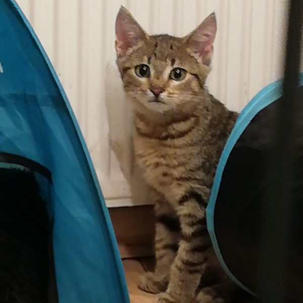 Kater (aufrecht zwischen den blauen Zelten) : Cyrano verdankt seinen Spitznamen seiner aristrokratischen Nase. Er spielt für sein Leben gern mit der „Katzenangel“ und liebt Leckerchen. Da er vom Bauernhof kommt und viel Katerstolz besitzt, ist er Menschen gegenüber noch etwas misstrauisch. Wenn man ruhig auf ihn zugeht, lässt er sich streicheln und sein Schnurren erfüllt den ganzen Raum ?. Katze (liegend) : Betty ist eine sportlich-elegante Katzendame und liebt Essen und spielen. Sie ist noch zurückhaltend und wird nicht gerne auf den Arm genommen. Wenn sie ruht, lässt sie sich streicheln und schnurrt zufrieden. Sie eignen sich für Katzenfreunde, die ihnen Zeit geben und für ältere Kinder. Wie sie auf Hunde reagieren, ist unbekannt, anderen Katzen gegenüber sind sie reserviert. Vermittlung gerne zusammen.
