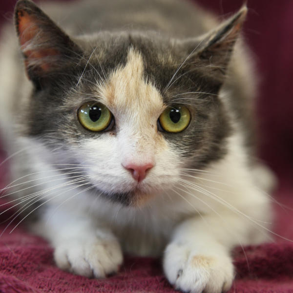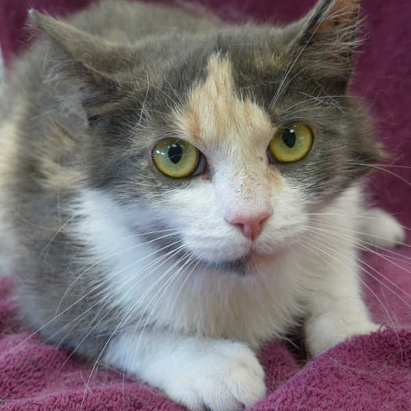 Die kleine, zarte, ca. 1-2 Jahre  junge, dreifarbige „Glückskatze“ ist vom Schicksal schwer gebeutelt worden. Fluffy ist sehr früh schwanger geworden und hat leider ihre Kinder verloren. Deshalb ist sie im Moment etwas traurig und sehr ruhig. Sie würde gern in ein Zuhause mit verständnisvollen Dosenöffnern ziehen. Fluffy braucht Freigang in einer verkehrsberuhigten Wohngegend. Kinder im Schulalter wären für sie kein Problem.