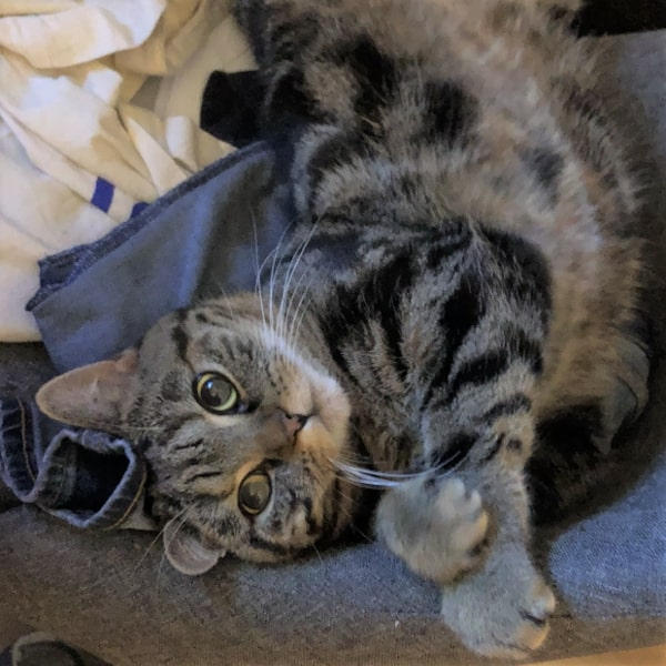 Balu ist ein absoluter Kuschler und Genießer. Auch wenn sein Schnurren nicht das lauteste ist, so merkt man sehr schnell, wie wohl er sich bei seinen Menschen fühlt. Balu folgt ihnen nahezu auf Schritt und Tritt, legt sich quasi immer zu einem auf den Stuhl oder Boden. Er durfte bisher im Bett schlafen und fand seine Lieblingsplätze an der Seite oder auf der Bettlehne, gerne verkroch er sich unter der Bettdecke und kuschelte sich ein. Wie wahrscheinlich jede Katze ist er ein begeisterter Jäger für alles was sich unter der Bettdecke nur so bewegt, hierbei kann es durchaus wild werden, ein gezielter Einsatz seiner Krallen oder Zähne gegen seine Menschen ist jedoch nie erfolgt, er ist eine absolute Samtpfote. Lediglich Kämmen gefällt ihm nicht und er wehrt sich. Balus Markenzeichen ist das Schlafen in Rückenposition – er sieht hierbei aus wie ein kleiner Otter 🙂 manchmal erzählt er auch viel und gurrt wie eine Taube, vorzugsweise sobald er etwas möchte. Des Weiteren leistet er einem gerne beim Duschen Gesellschaft und wartet bis man fertig ist und fordert dann eine ausgiebige Streicheleinheit ein. Auch wenn er sehr aufgeschlossen seinen ihm bekannten Menschen ist, so flüchtet er doch wenn Besuch kommt und muss sich das ganze aus der Ferne ansehen.