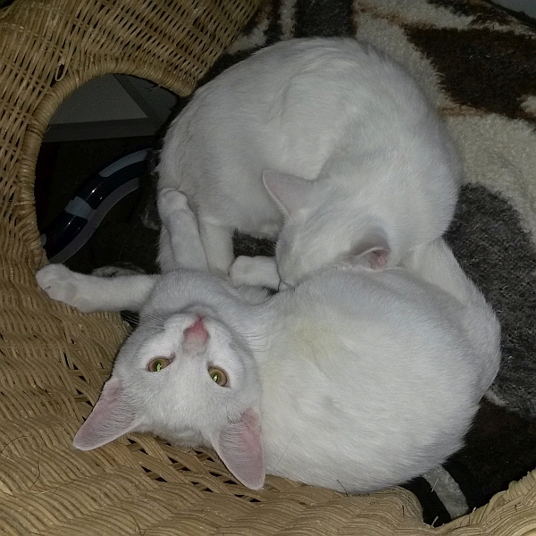 Die Brüder Lupin und Sirius wurden von einer jungen Mama geboren. Sirius ist der Schmuser, Lupin spielt lieber und ist noch was schüchterner, er ist wie viele weiße Katzen taub und kann daher schon etwas lauter werden. Vermutlich stecken in den beiden Schneeflocken orientalische Wurzeln: Sie toben und klettern gerne. Fenster und Balkon sollten sehr gut gesichert sein. Sie kuscheln gerne miteinander, raufen und jagen sich aber auch liebend gern. Vorhandene Katzen sollten nicht zu schüchtern sein.
